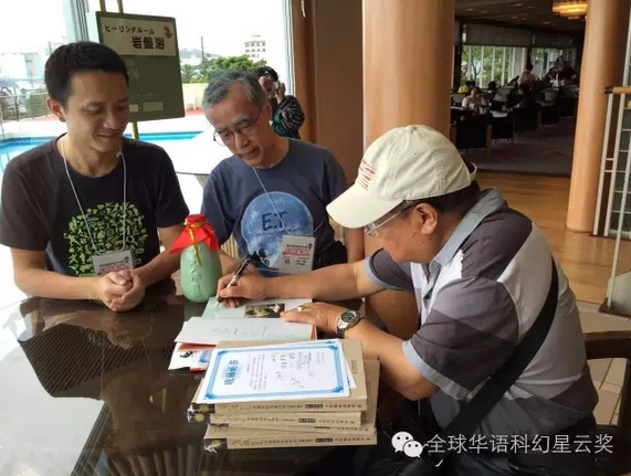 董仁威(右一)向日本科幻作家林久之签赠《穿越2012》