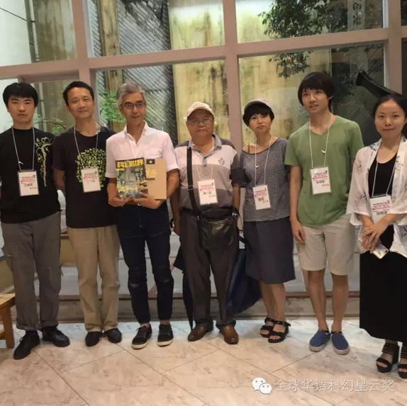 中国科幻代表团王维剑、丁丁虫、董仁威、糖匪、梁清散、程婧波与藤井太洋(左三)合影