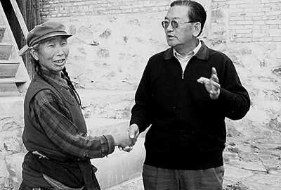 石仲泉与毛泽东同志在俄界住过的房主的后代握手
