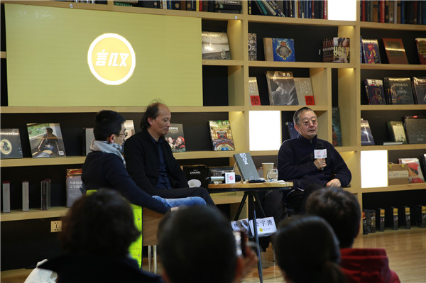 活动现场。金宇澄(中)与阿城(右)对谈。