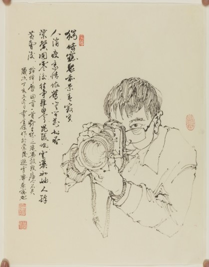 全保的自画像作于丁亥(2007年)立冬,经友人介绍入围«百美图»。画中的他正聚精会神地举起相机在拍摄稍纵即逝的老房子,脸部被镜头遮住,只露出了半脸。画上他还题了调寄点绛唇的小令:“独倚窗聚和,景春寂寞人消瘦。豪情依旧,莫问花知否? 兰馨凋零后,往事难回首。毘陵吼,云溪如岫,人醉黄昏后。” 词中对古城建筑被毁痛心不已。