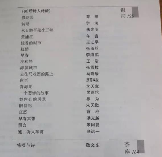 与百位90后诗人扶持计划相呼应,《诗刊》2017年2期下半月刊开设了“90后诗人特辑”,以半本刊物的分量向诗坛隆重推出了莱明、李琬、朱光明、午言等19位90后诗人的佳作。