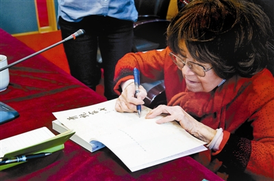 就这样,这位九十岁的老人没有休息,没有喝一口水,讲了两个小时,之后又耐心地为读者签名留念,签名时让她吃口冰棍解解渴,她说要等到所有的签名都结束再吃。问她累不累,她说,不累,看到有这么多读者喜欢她,高兴。