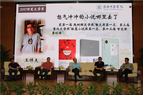 6月17日下午,来自山西、天津、河北、山东的四位作家王祥夫、龙一、李浩、刘玉栋作为论坛主讲,在淮师知名校友、老舍文学奖、鲁迅文学奖获得者徐则臣的主持下就一系列文学问题发表了自己的看法。四位作家分别以“怒气冲冲的小说哪里去了”“作家是谁”“作为背景的时代”“历史、传统与中国故事”为题与同学们进行了深入的交流。“四手联弹”异彩纷呈,不同的创作经历和阅读趣味使得五名作家的讲述各有特色,对写作的认知、对阅读的建议发人深省,论点的碰撞、思想的交锋引人入胜。