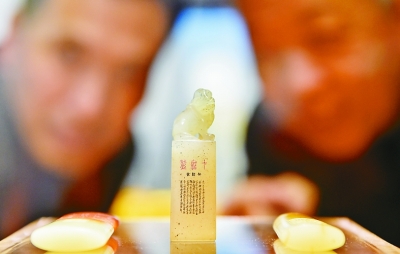 观众在欣赏艺术家侯贞诚以林则徐“十无益”家训为题材创作的寿山石行楷微雕印章。新华社发