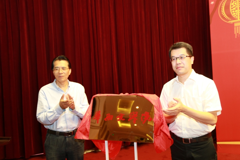 中国作协副主席何建明与江阴市委常委、宣传部部长程政共同为华西文学院揭牌