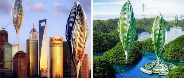 漂浮的空中花园,科幻家幻想未来人类可以建造漂浮于空中的巨型漂浮建筑,这是与上海最高楼的对比