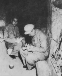 坑道是凹字形的,出口外边是机枪掩体。这里是名副其实营连防御阵地最前沿。战士握着枪从射击孔目不转睛观察敌情。巴金从射击孔向外看得清清楚楚。河东岸阴森、冷凄,山腰部的黑洞洞,身边的战士告诉他,那是敌人的工事。山梁上矮矮的松树林,一动不动……巴金看着看着说了声:“敌人! ”的确,有两个戴钢盔的从松林里跑出来,到了他们前面山洼上的位置。敌人有活动!许副团长带巴金离开了机枪掩体,顺交通沟走去。这里只要一挺身,踮踮脚,可以把敌人阵地的一切尽收眼底。