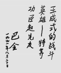 1991年夏天,英雄所在部队为了进行革命传统教育,决定在部队营区建立一座三米多高的英雄赵先友塑像,敬请近百岁的巴金题词,请老团长张振川撰写碑文。巴金不顾年事已高题写了下面的文字: