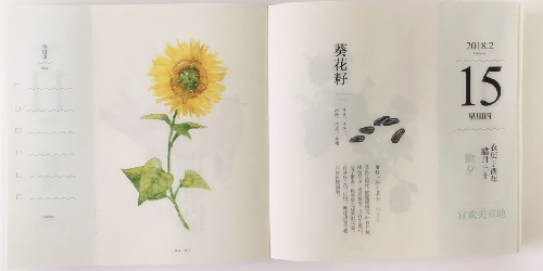 年10月中国轻工业出版社推出《时光本草》日历书(2018版)。《时光本草》是一本以本草为主题的日历书,书中包含365种食物本草图,每天一幅清新纯美的手绘食物,每天一段治愈身心的本草解读。这本书能满足每日撕扯日历的仪式感,一年之后,还能留下一本完整的食物本草图谱。这是对第一版《时光本草》日历书(2017版)的一次全面升级。