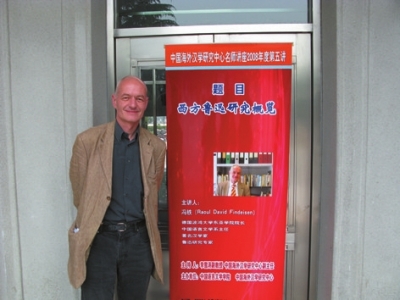 2008年5月15日,冯铁在北京外国语大学讲座海报前留影