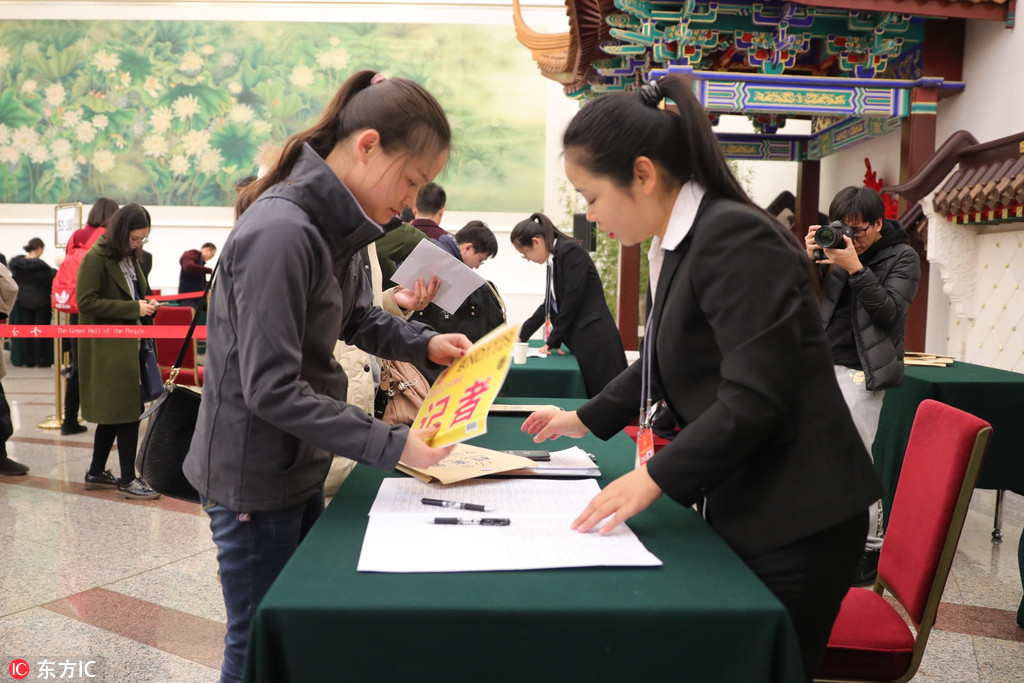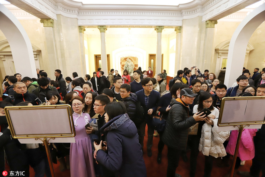 2018年3月1日,2018年全国两会即将召开,在人民大会堂,记者排队领取记者证。据悉,十三届全国人大一次会议和全国政协十三届一次会议将分别于3月5日和3月3日在北京开幕。目前已有3000多名中外记者报名采访全国两会,其中境内记者2000人左右,港澳台记者和外国记者1000多人。