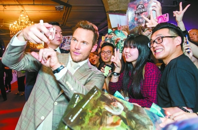 影片男主角“星爵”帕拉特在红毯上与粉丝互动。