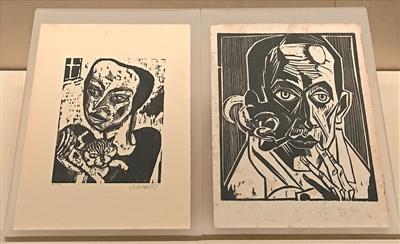 鲁迅藏品《女郎与猫》(峩洛司基 木刻版画) 《自画像》(沛息莫可坦因 木刻版画)。