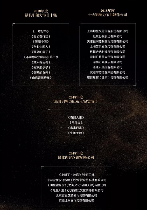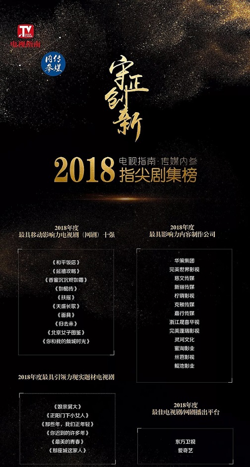 《电视指南》杂志社执行社长、传媒内参主编温静发布了“2018年度综艺-剧集-融媒体报告”。为了做到客观、公正、准确和权威,调研组从宏观管理、题材备案、行业秩序等各个角度,为此次论坛进行了历时3个月的调研工作。《报告》指出,今年正值改革开放四十周年和电视剧诞生六十周年,创作回归“内容为王”,在“小成本”“大情怀”“正能量”的指导下,“守正创新”成为这一年内不可忽视的关键词,并重塑着整个产业的发展。论坛现场发布了“2018指尖融媒榜”、“2018指尖综艺榜”与“2018指尖剧集榜”。在“指尖剧集榜”中,《娘亲舅大》《正阳门下小女人》《那些年,我们正年轻》《你迟到的许多年》《最美的青春》《那座城这家人》等6部剧获“2018年度最具引领力现实题材电视剧”,各类榜单的发布表达了对优秀剧集、平台、公司的肯定与期待。