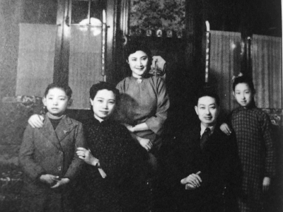 言慧珠和梅家人合影。从左至右:梅葆玖、福芝芳、言慧珠、梅兰芳、梅葆玥。