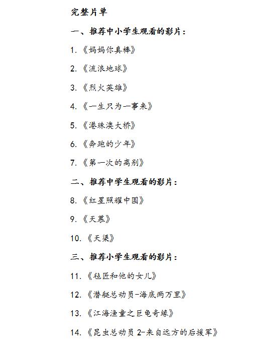 17日,教育部官网公布《第39批向全国中小学生推荐优秀影片片目》,包括7部推荐中小学生观看的影片,3部推荐中学生观看的影片,和4部推荐小学生观看的影片,《流浪地球》《烈火英雄》《港珠澳大桥》《第一次的离别》《昆虫总动员2-来自远方的后援军》等影片入选。