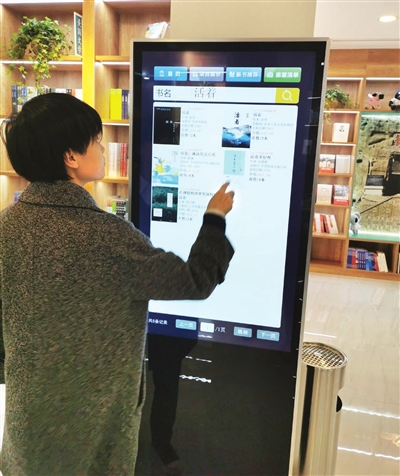 店内深处放着综合展示一体机和OPAC检索机。综合展示一体机可查看当季新书推荐、推荐书单和浏览基于大数据的图书销量排行榜,点击屏幕后,记者输入“活着”,屏幕显示了两个版本的余华的《活着》,还有书名里有“活着”二字的蔡澜的《活着,就该尽点儿兴》、汪曾祺的《活着多好呀》、雪小禅的《在薄情的世界里深情地活着》,显示信息包括书名、作者、出版社、出版日期、价格、店内在售图书存量。如果当时没有检索到想要图书,可点击“愿望清单”,工作人员会尽快满足读者购书意愿。