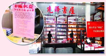 走进钟书阁徐汇店,店内新辟出近20平方米的一处独立活动空间,“先锋书屋”四个大字十分醒目,以红色读物为主题的“四史”学习教育推荐书单和相关格言,营造出火热的气氛。