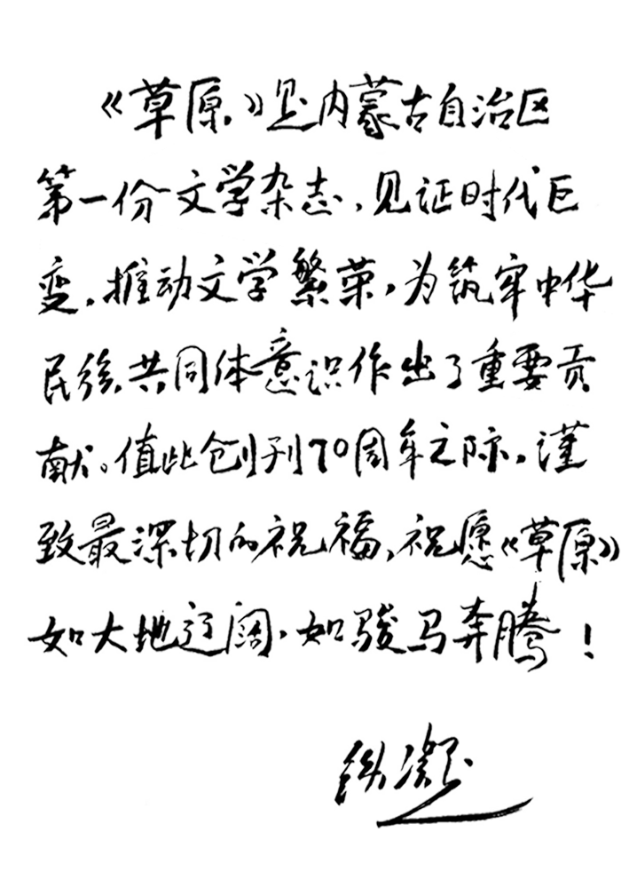 《草原》是内蒙古自治区第一份文学杂志,见证时代巨变,推动文学繁荣,为筑牢中华民族共同体意识作出了重要贡献。值此创刊70周年之际,谨致最深切的祝福,祝愿《草原》如大地辽阔,如骏马奔腾!