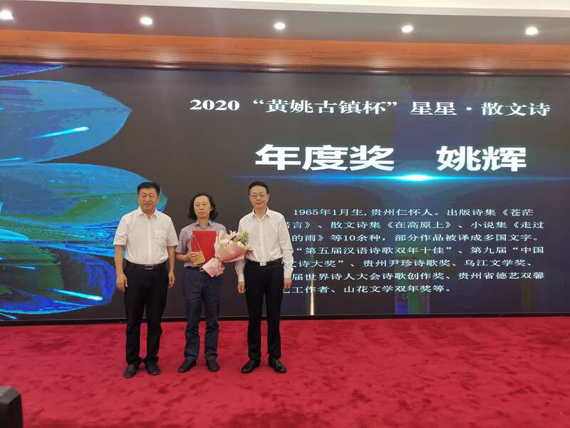 2020年度“黄姚古镇杯”星星散文诗年度奖获得者姚辉(中)。