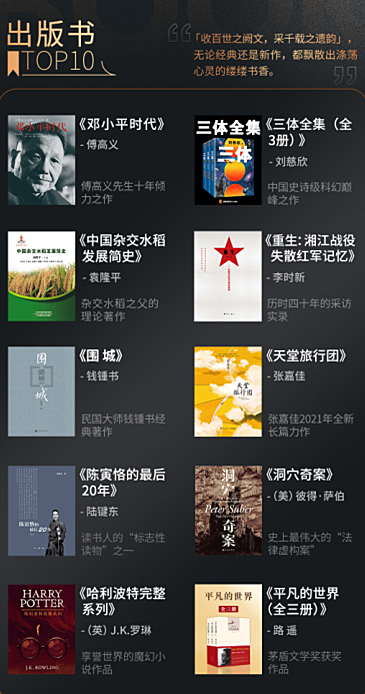 成立多年来,掌阅科技致力于正版阅读、品质阅读,与700余家优秀的出版同仁合作,将海量优秀质图书呈现在读者面前。在本次的年度出版书推荐中,《邓小平时代》《重生:湘江战役失散红军记忆》《天堂旅行团》等十部出版精品上榜。