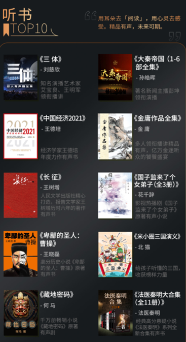 随着数字阅读技术移动化、视听化的不断演进,“听书”成为当下最为流行的数字阅读方式。掌阅听书节已成功举办三届,在本次的年度听书推荐中,《长征》《中国经济2021》《三体》等十部精品有声书上榜。