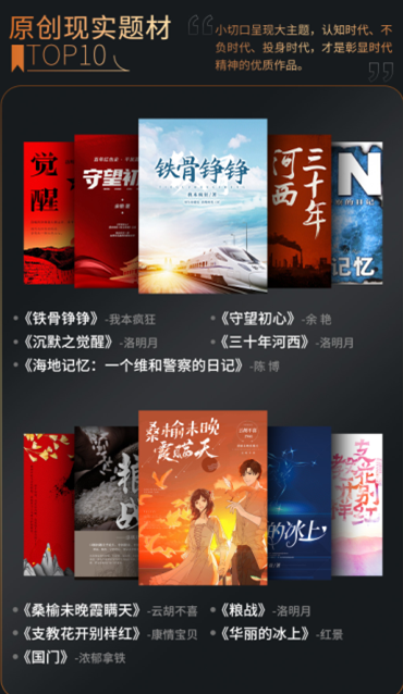 现实题材已成为原创网络文学的重要创作方向,近日中国文联十一大、中国作协十大召开,会议指出要深刻把握民族复兴的时代主题,把文艺创造写到民族复兴的历史上,写在人民奋斗的征程中。近年来,掌阅科技助推现实题材原创网络文学创作,涌现了一批又一批优质作品。在本次原创现实题材推荐中,《铁骨铮铮》《守望初心》《海地记忆:一个维和警察的日记》等十部作品上榜。
