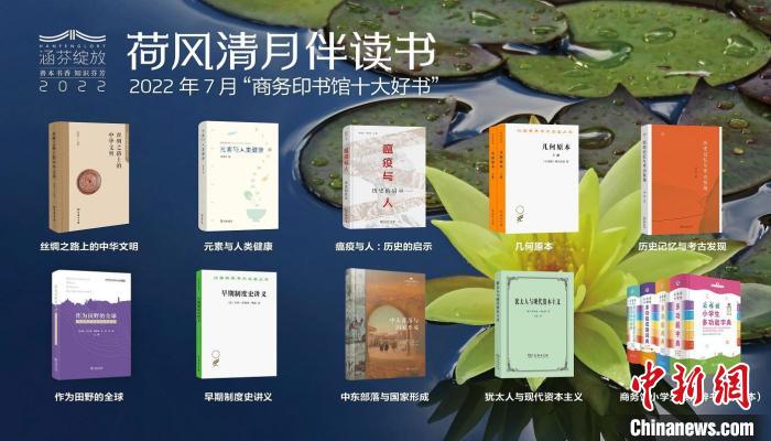商务印书馆“荷风清月伴读书:月度新书发布会”8日晚在线举行,发布了2022年7月“商务印书馆十大好书”,分别是《丝绸之路上的中华文明》《元素与人类健康》《瘟疫与人:历史的启示》《几何原本》《历史记忆与考古发现》《作为田野的全球:清华大学地区研究拾年巡礼》《早期制度史讲义》《中东部落与国家形成》《犹太人与现代资本主义》和“商务馆小学生系列辞书(彩图本)”。