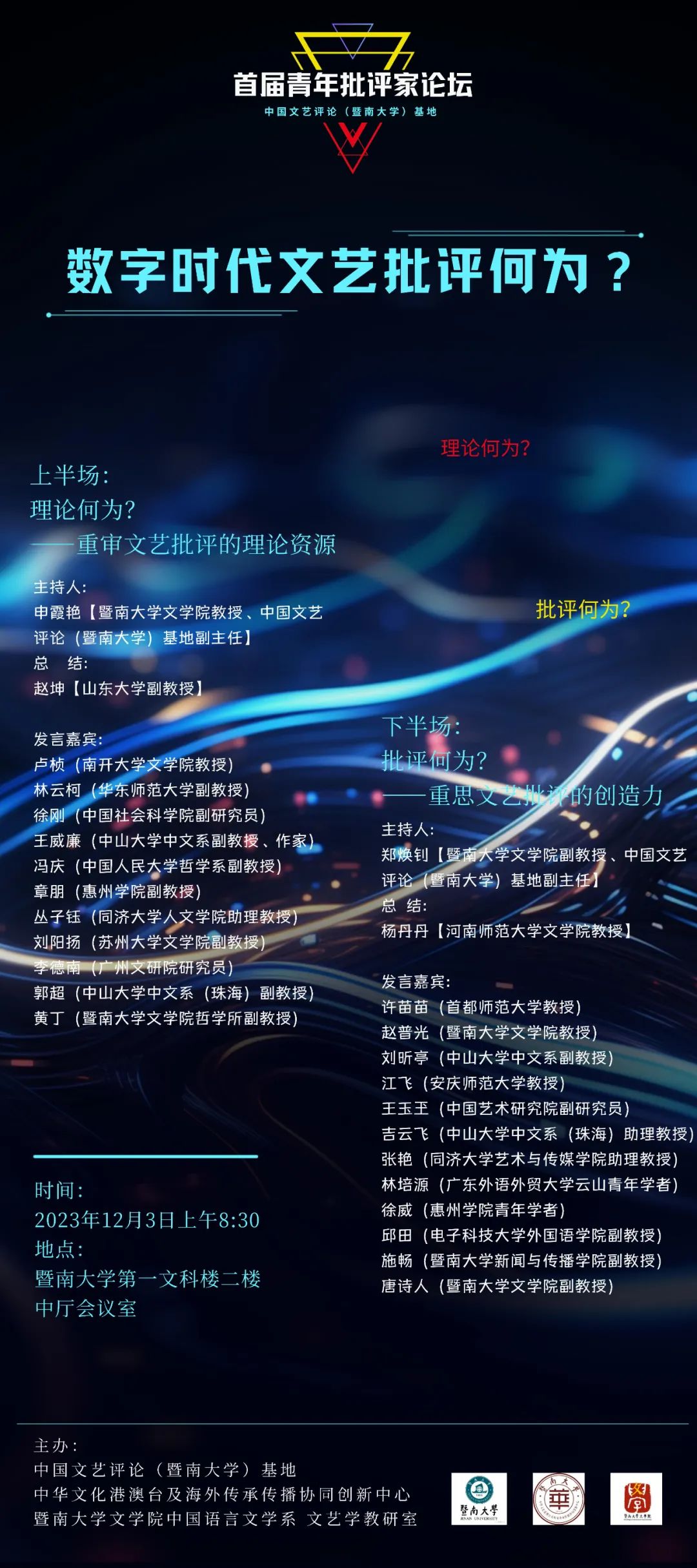 12月3日,由中国文艺评论(暨南大学)基地、暨南大学文学院中国语言文学系文艺学教研室主办的首届青年批评家论坛在暨南大学文学院举行,来自中国社会科学院、中国艺术研究院、中国人民大学、华东师范大学、同济大学、中山大学等高校和科研单位的青年批评家出席本次论坛。论坛分上下半场,上半场主题为“理论何为?——重审文艺批评的理论资源”,下半场主题为“批评何为?——重思文艺批评的创造力”,分别由中国文艺评论(暨南大学)基地副主任申霞艳、郑焕钊主持。