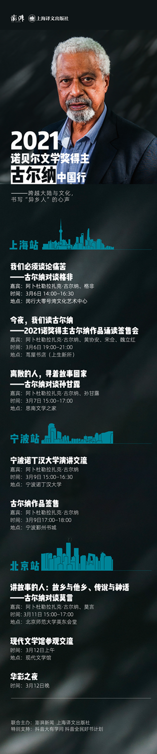 3月6日,诺贝尔文学奖得主古尔纳将与茅盾文学奖得主格非在华东师范大学大零号湾文化艺术中心对谈。这也是“古尔纳中国行”第一场活动。中国作家网视频号将进行同步直播。