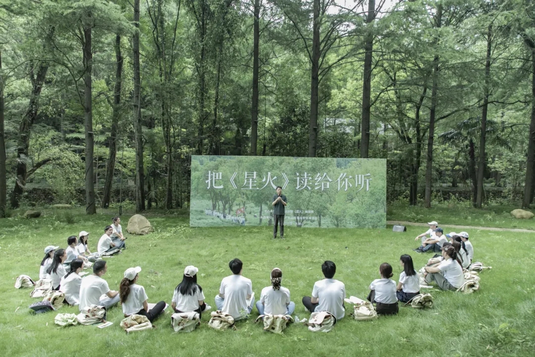 在大茅山景区宛如一张绿色巨毯的草坪上,与会者席地而坐,把《星火》读给驿友和游客听,游客们循声过来,朗读《星火》诗文并分享在旅途邂逅文学的心情。一位4岁的小朋友在外公上场朗读,又为主持人拍下文艺的美照,把现场气氛推向高潮。