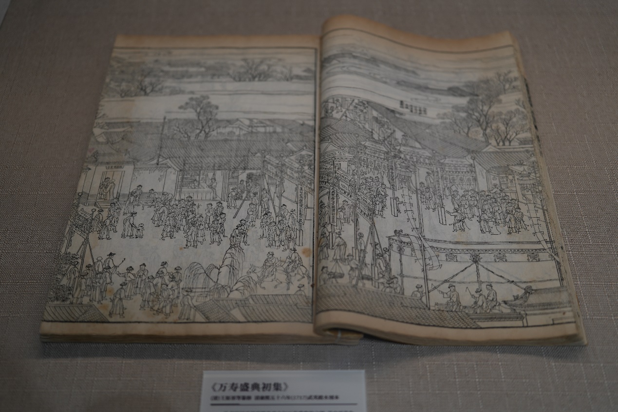 《钦定大清会典图》是以图说形式记载清朝典章制度的专书,其礼类版画记录了各大坛庙的建筑布局和祀典陈设,还原了中轴祀典的盛况。以武英殿为主的官方刻书机构所出版画制作精良,称殿版版画。首都图书馆馆藏典籍《万寿盛典初集》是康熙年间殿版画的代表,记录了庆贺康熙六旬寿辰的仪仗场面,尽显中轴威仪。清末石印术传入后,石印版画插图蔚然成风。《点石斋画报》是早期石印图像的典型代表,由画家吴友如主持编绘,以一种富于时代特色的绘画新风创作时事新闻画,既记录了进贡、祝寿、祭祀等皇家典仪场面,也描绘了别岁、冰嬉等民间生活图景。此外,实物展品还展出了版画发展史上的代表作,如《十竹斋书画谱》《芥子园画谱》等,方便读者近距离品赏版画的独特美感。