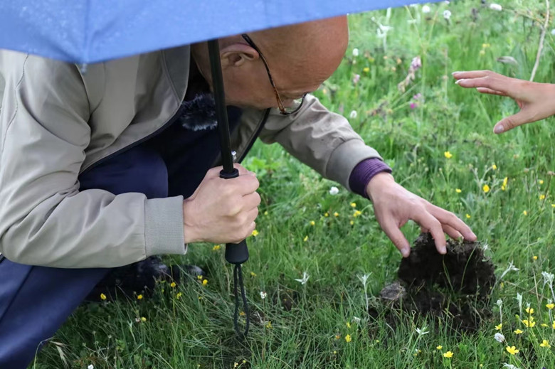 高原缺氧的反应还没有袭来,来自平原的我们兴奋激动地拍摄,镜头里满是层次丰富的色彩。清澈的溪流缓缓流淌,小花恣意绽放,还有辛勤挖洞的鼠兔,都是有故事的生灵。杨志军像个导游,讲解历史、地理、文化、植物的来龙去脉;也像一位植物学家,时不时用双手扒开牦牛粪,分享这个“草原宝贝”里的生态秘籍,更像一位归家的游子,带着对细节的熟悉与眷恋。