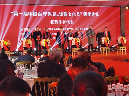 今年7月,为传承和弘扬中华优秀传统文化,推动“百年保定”酒的文化影响力,促进京津冀诗歌协调发展,助力保定和雄安新区新时代文化再攀高峰,《诗刊》社、中国诗歌网、雄安保府酒业有限公司、中国市场学会京津冀产业发展研究院等单位联合举办“百年保定·全国诗歌征文大赛”,面向社会公开征稿,共收到参评作品一万多首,涉及现代诗、古体诗词以及歌词。经过《诗刊》社、中国诗歌网编辑的初评以及七位终评委的投票,评出金顶诗人奖5名:北野(河北)、慕白(浙江)、邹黎明 (江苏)、羽微微 (广西)、张牧宇(吉林)金顶诗人奖5名,红顶诗人奖10名:阿剑(甘肃)、毕俊厚 (河北)、安知雀(广西)、万世长(陕西)、王文海(山西)、王喜(甘肃)、阿沛(广东)、陶少亮(湖北)、程杨松(江西),以及桑寒(河北)等蓝顶诗人奖20名、优秀诗人奖20名。