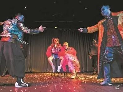 说到连接现实,就不得不提到《罗吉》的戏中戏设计。剧中的伶人戏班不再如《哈姆雷特》原著中那样,仅仅演出了用于试探新王的《捕鼠器》。他们靠表演谋生,“什么挣钱就演什么”;他们把“鲜血、爱情和死亡”当作卖点,所有的表演都是为了满足观众的猎奇心理与感官需求。舞台上浓妆艳抹、奇装异服、表演低俗的伶人戏班,与戏剧家格洛托夫斯基曾经批判的演员别无二致——他们的身体仅仅是获利的工具,他们的表演也是虚假的技巧堆砌。