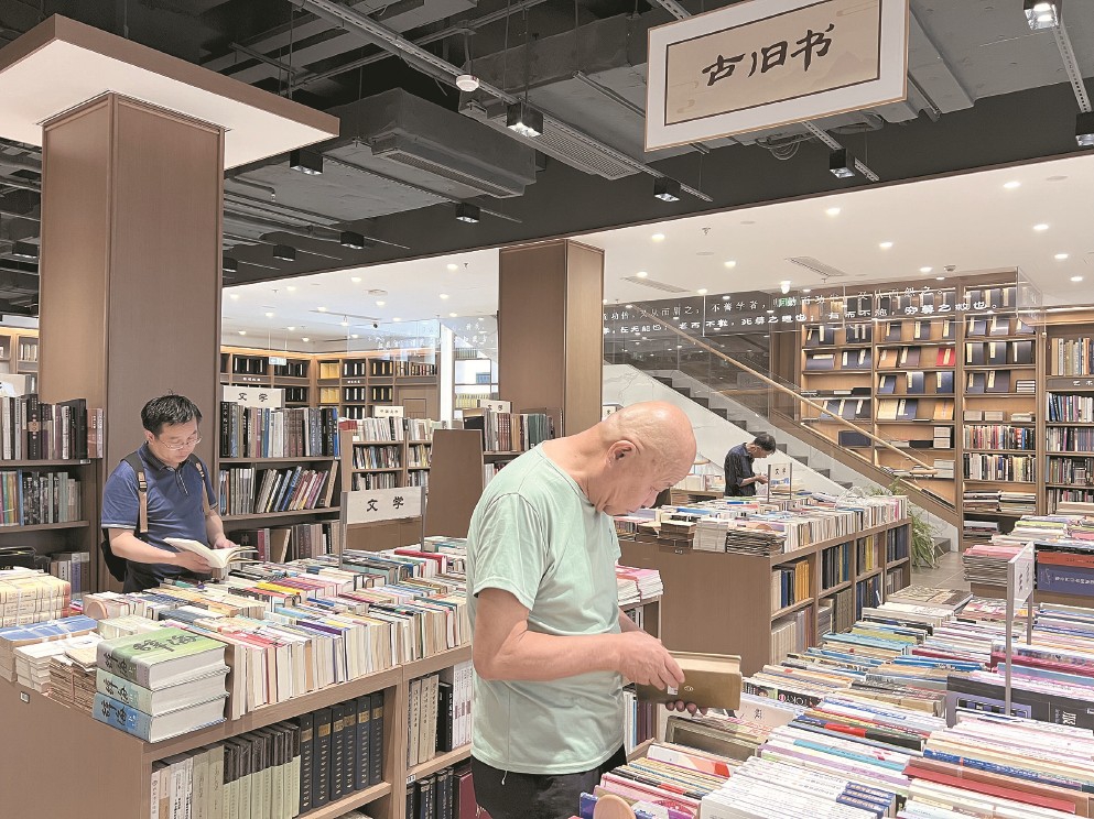 书店三楼既有按经、史、子、集分类陈列旧版线装书的“博古斋”,又有汇集旧书的“淘书乐园”,还有定期开张的屋顶旧书市集。《威尼斯商人》《巴黎圣母院》《百年孤独》……大量外国文学作品,吸引了陆先生驻足。他说,在书店翻实体书、淘旧书和线上看电子书的感觉是不一样的,“更有开盲盒的惊喜感”。上海图书公司副总经理程犁告诉记者,旧书市集除了购买图书,还结合讲座、展览、工作坊等多种形式,增加市集互动性和教育性,不断下沉至全市各街镇社区,精准对标爱书人文化需求,将书送到“最需要的读者身边,市民的家门口”。