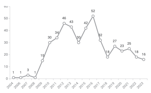 图2:莫言作品的日本读者评价数量趋势(2008—2023)