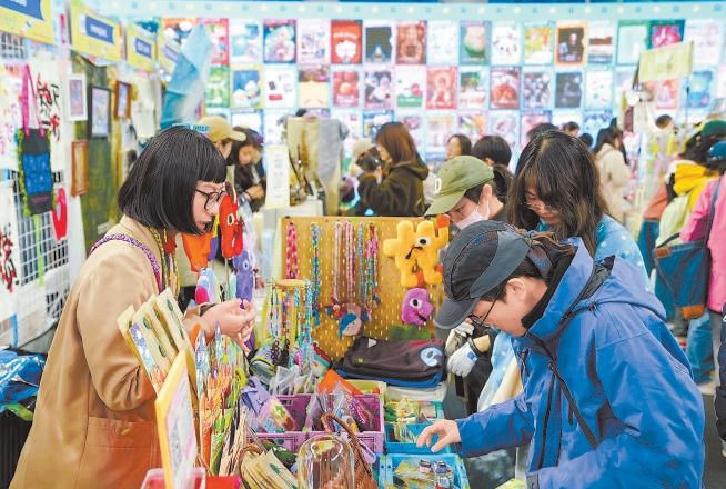 市集主展区,百余家出版文化与艺术文创摊主均匀地分布在国家网球中心钻石球场一楼场芯展区和二层环廊展区。众多摊主不仅带来了海量新书,也带来最新的文创潮玩。