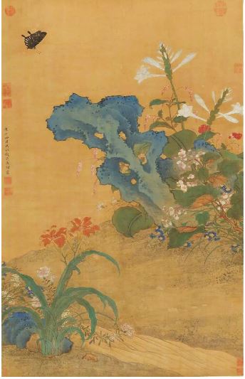 明代画家文俶是著名画家文徵明的玄孙女,她擅画花卉虫蝶,创作出诸多精美的花鸟画作。她曾绘有一幅《秋花蛱蝶图》,如今收藏于天津博物馆,画面中描绘了初秋之际花卉盛开,蝴蝶翻飞,流水潺潺的美丽景象。狭窄的溪流两侧鲜花盛开,色彩鲜艳,有蓝色的雏菊、粉嫩的竹节海棠、橘色的萱草、白色的玉簪、粉白的红蓼、艳红的石竹以及其他诸种草花。挺拔嶙峋的太湖石立于花草之间,既丰富了画面内容,增添画面层次,又调和了画面色彩。画面左上方,一只黑色蝴蝶被繁花吸引而来,正扇动翅膀,缓缓落下。画家对花卉的刻画十分精准,传神勾勒出不同花卉的花朵形态。在刻画萱草花朵时,画家综合运用留白、勾线、晕染等多种手法,巧妙呈现出花瓣上的色彩变化和纹理结构,使笔下的花卉生动传神,别具风姿。