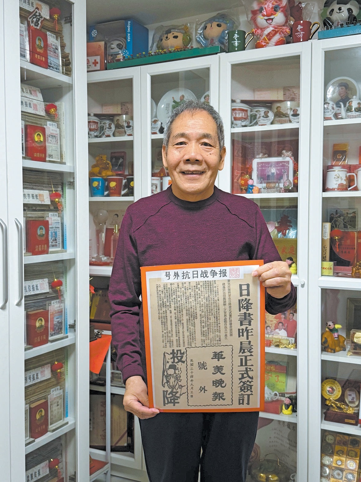 今年夏天,李铁光又忙着办起了“纪念中国人民抗日战争暨世界反法西斯战争胜利80周年”报展。他从400多份抗战相关报纸中精选出280份,其中1945年9月3日的《华美晚报》号外格外引人注目,纸页上“日降书昨晨正式签订”的标题,成了最有力的历史见证。开展当天,不少家长带着孩子来参观,李铁光站在报纸前,给孩子们一一讲述。“我们要记住过去,才能珍惜现在的好日子。”李铁光说。