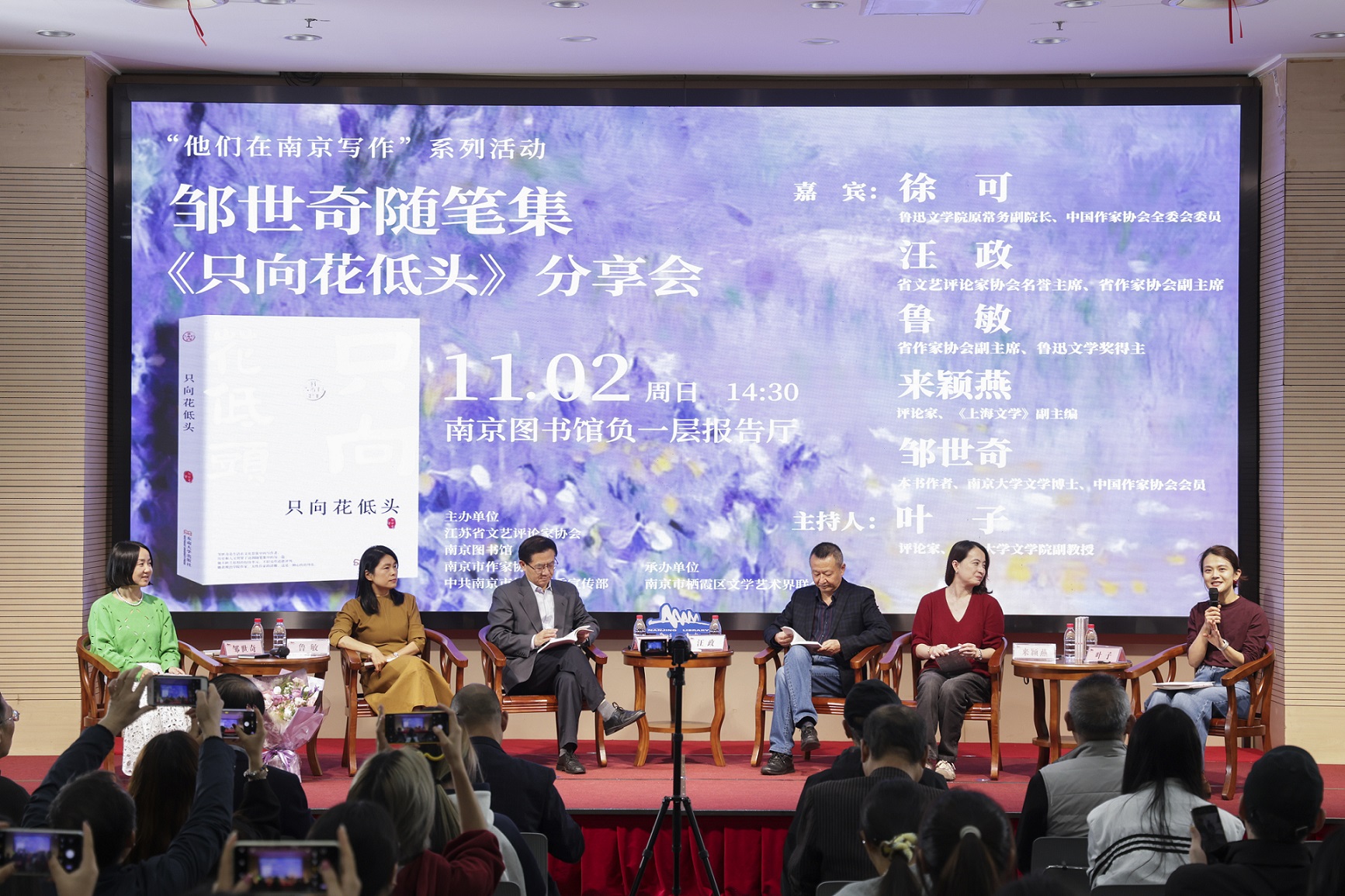 11月2日,江苏省文艺评论家协会、南京市作家协会、中共南京市栖霞区委宣传部主办的青年作家邹世奇随笔集《只向花低头》分享会在南京图书馆举行。鲁迅文学院原常务副院长、中国作家协会全委会委员徐可,江苏省文艺评论家协会名誉主席、省作家协会副主席汪政,江苏省作家协会副主席、作家鲁敏,评论家、《上海文学》副主编来颖燕,本书作者、南京大学文学博士、中国作家协会会员邹世奇参与分享,分享会由评论家、南京大学文学院副教授叶子主持。