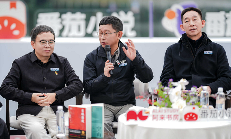 中国作协副主席、四川省作协主席、著名作家阿来(中)、《仙剑奇侠传》小说作者管平潮(左一),中华文学基金会理事长施战军(右一)在直播现场。