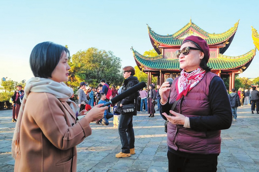 香港作家周蜜蜜在岳阳楼前接受岳阳日报记者采访。岳阳市作协供图