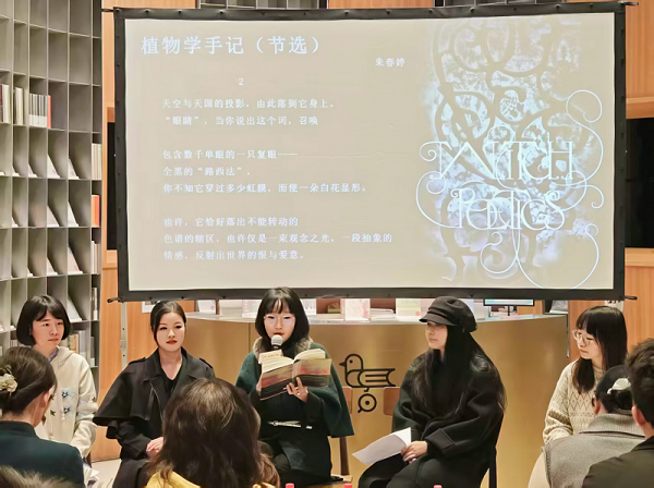 作为这部诗选的主编,朱春婷特别强调了“城市漫游者”团体在创作过程中,对语言与灵性的关注。她认为,和欧洲中世纪城市化进程而出现的巫之传统不同,中国传统文化中的巫觋文化重视用祝祷的方式,来打通天、地、人之间的壁垒。语言在创世之初的混沌中,命名和分别了事物,这一过程是伴随“创造性”的行动发生的,是海德格尔所说的“存在之家”。而诗歌对语言实验和既定思维的挑战,使得诗人需要不断挣脱语言和想象力的边界,像普罗米修斯盗火一样,带来一些出离既又规范的“词语”和“逻辑”。它如同一场必然失败的修行,但又因仿佛在无限趋近真相,而令创作者自觉无限荣耀和幸福。朱春婷随后朗诵了自己的诗歌《植物学手记》,分析了其中的重要意象。