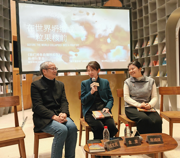 发起于上海的诗歌团体“城市漫游者”出版了《我们将各自辗转如岛:城市漫游者诗选》(2025),中国社会科学院周瓒教授曾以“写诗的女巫”一语形容该诗集呈现出的独特面貌。日前,“城市漫游者”主要成员在思南书局·诗歌店相聚,就诗歌选集举办了新书分享会兼诗歌朗读会“在世界塌缩成一粒果核前”,与华东师范大学教授金雯、书评人陈嫣婧、上海大学教授钱文亮等特邀嘉宾,以及到场读者一起分享创作。