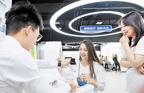 6月14日,第二届雄安未来之城场景汇未来城市场景体验周展厅内,科幻作家现场体验中医AI辅助诊断设备“望闻问切”。记者刘光昱 摄