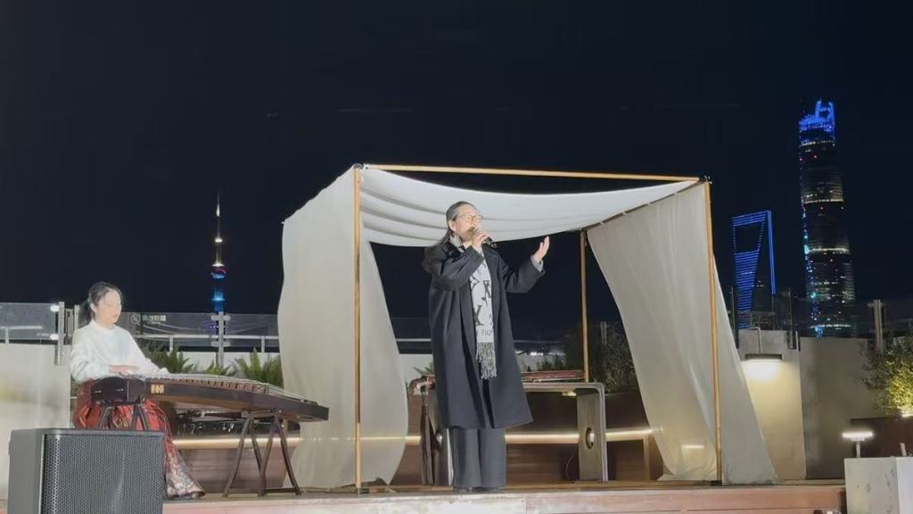 音乐成为诗歌的翅膀。由艺术学博士、古琴演奏家王鹏领衔,汇聚潘天行(笛箫)、沈美含(琵琶)、田易敏(古筝)等沪上优秀青年演奏家的古典乐团队,穿插演奏了《春江花月夜》、《梅花三弄》、《渔舟唱晚》、《良宵引》等经典名曲。乐声时而作为序引,时而为诗伴奏,实现了“诗中有乐,乐中有诗”的沉浸式艺术交融。古乐的悠远意境与诗歌的现代意识相互碰撞、彼此照亮,完美诠释了“当代与传统交融,现代与古典并蓄”的活动主旨。
