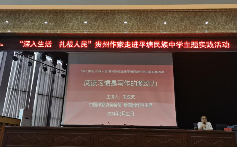 5月21日,为在校园深植文学种子,作家们走进校园,与学生面对面交流,黔南州作家协会主席朱双艺还为400余名高中生上了一堂题为《阅读习惯是写作的源动力》的文学课。