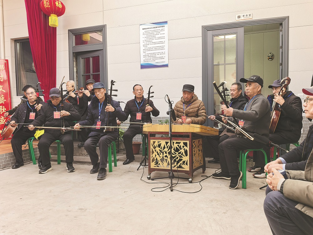 甫一进院,小院主人冯忠祥即热情邀请我们先观看几段演出,能如此近距离接触秦腔的机会并不多见。小院中央是一个简易舞台,背景悬挂着深蓝色幕布,两侧是一副对联:“乡村文艺歌盛世,庭院秦腔颂党恩。”左手边,鼓点铿锵,堂鼓、梆子、大锣、小镲,各司其职;右手边,弦乐悠扬,板胡、扬琴、阮、提琴,起伏有致。村民们整装上阵、开嗓献唱,既有《金沙滩》《状元媒》等传统剧目,也有现代戏《血泪仇》选段。